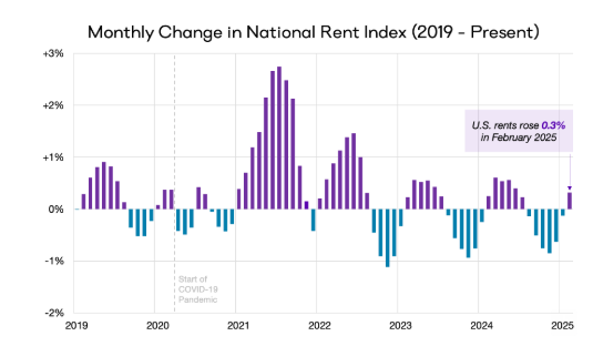 Nationwide, the rental market is showing signs of change. In February 2025, rents saw a 0.3% increase, marking the end of six consecutive months of decline. This uptick is particularly noteworthy because February typically signals the start of the busy season for rentals, with rents expected to rise through spring and summer. However, it's important to keep in mind that the national median rent ($1,375) is still 0.4% lower than it was a year ago.