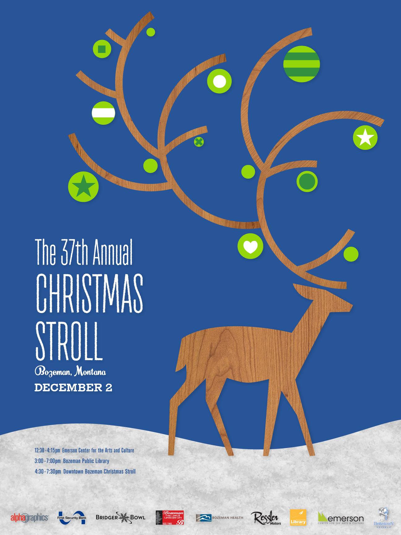Downtown Bozeman Christmas Stroll - 4:30 PM. : Join us for Bozeman's most beloved holiday tradition and come kick-off the holiday season in Downtown Bozeman! Join us for fun activities, great food, and fun. Bring the whole family to ride on the hay wagons, get your picture taken with Santa Claus, watch the lighting ceremony of the downtown decorations, check out the gingerbread house contest display, sing Christmas carols, grab a bite to eat from one of over 40 non-profit food vendors or do some Christmas gift shopping. The Christmas Stroll is the place to find it all. Learn more: http://bit.ly/2i1vjtG